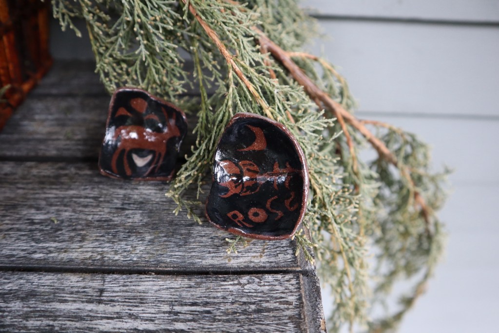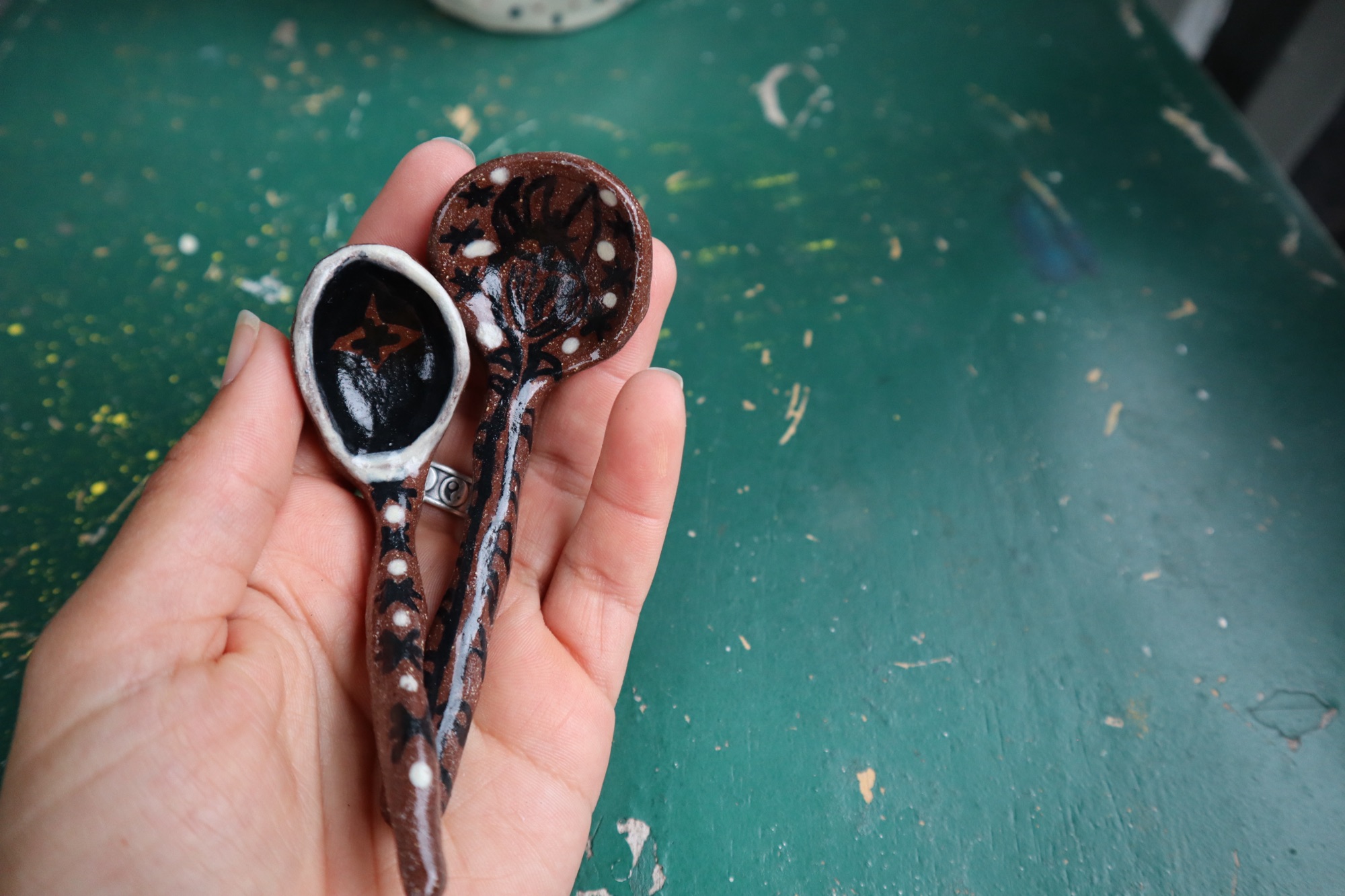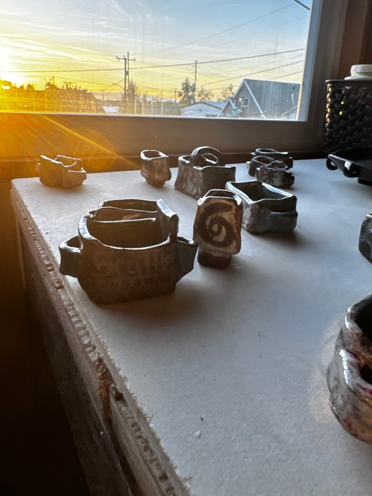 I only went to one concert this year. The past couple years I have gone to at least three. This year I saw one of my favorite bands. It is a guy that is almost sixty and had a grunge band back in the 90s. Still got it though. I wanted to give him a gift as a thank you for his music that I love. So I made him a ceramic dish smaller than a pinky. So small when I gave it to him he just slipped it in his pocket. The band is called SunKilMoon, so I used slip to draw a sun on one side and a moon on the other. I loved it so much kind of wish I kept it for myself. So I made some other version of the same thing.