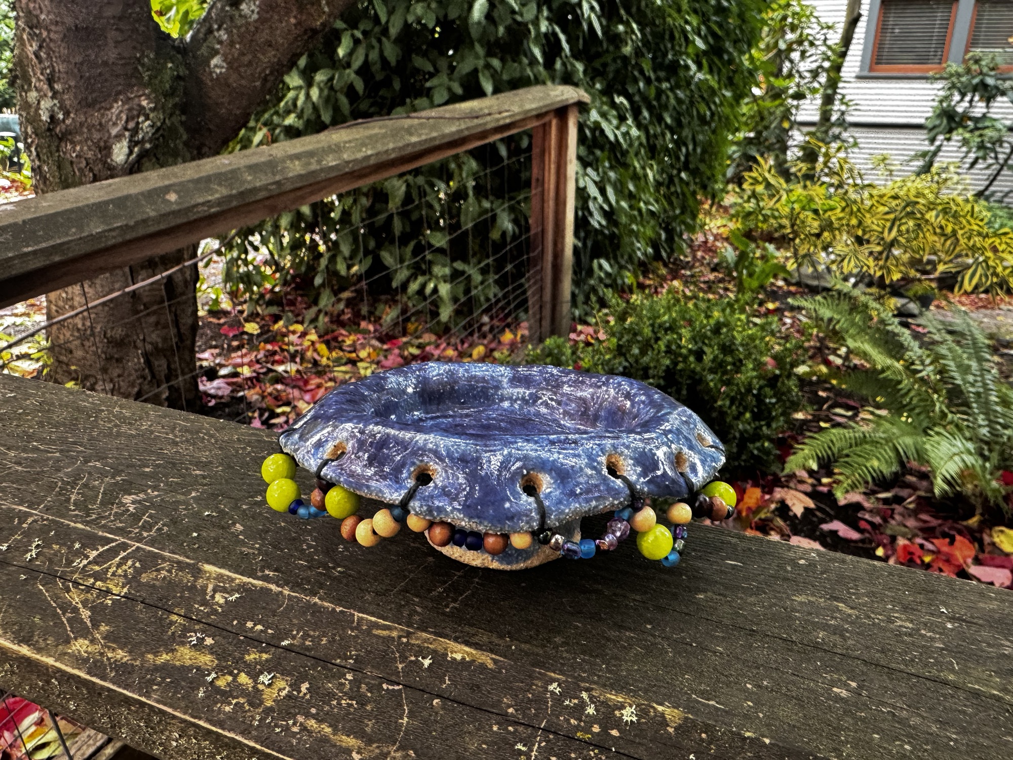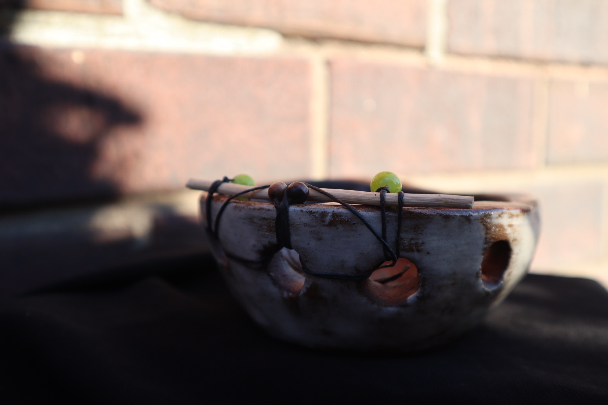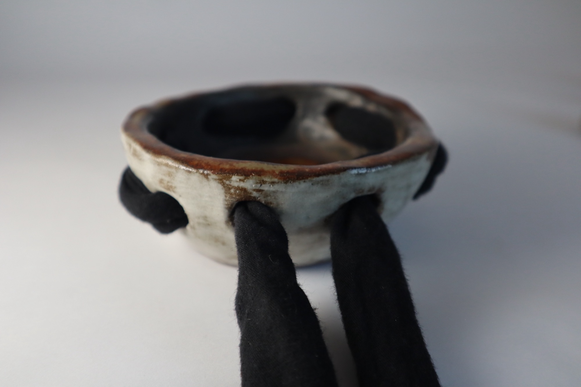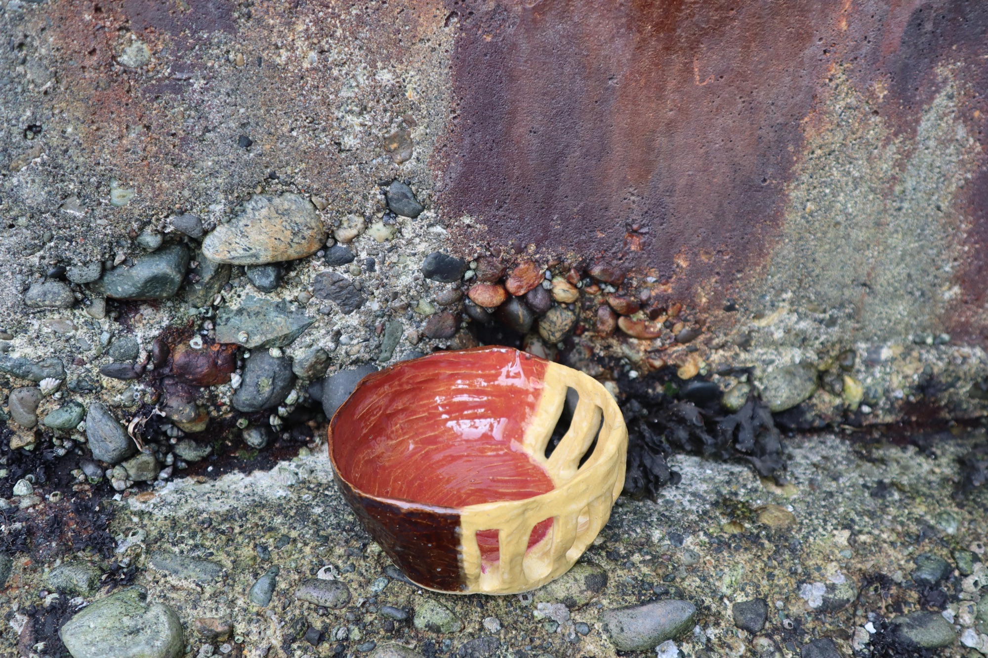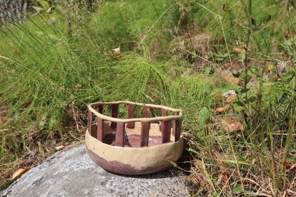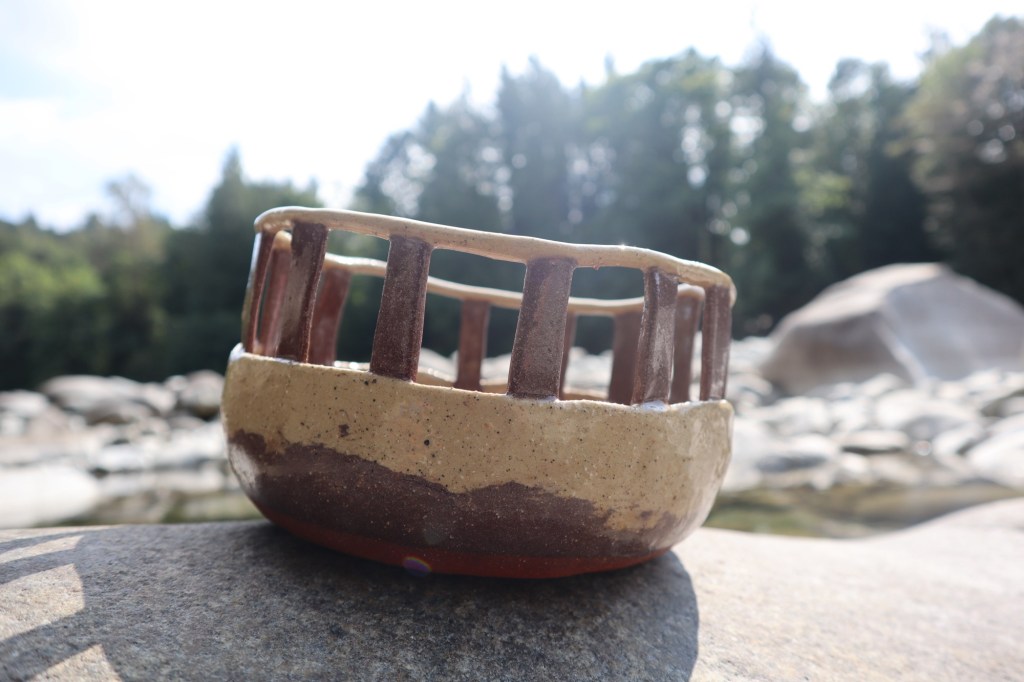 These holes are larger than I would want for the size of the dish. Very small bowl. Not enough for noodles, it is pores on the inside because it has unglaze bits. This is a small bowl but I am proud. I wanted to add more materials than clay to my projects. The holes gave me more space to create outside of the kiln.